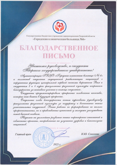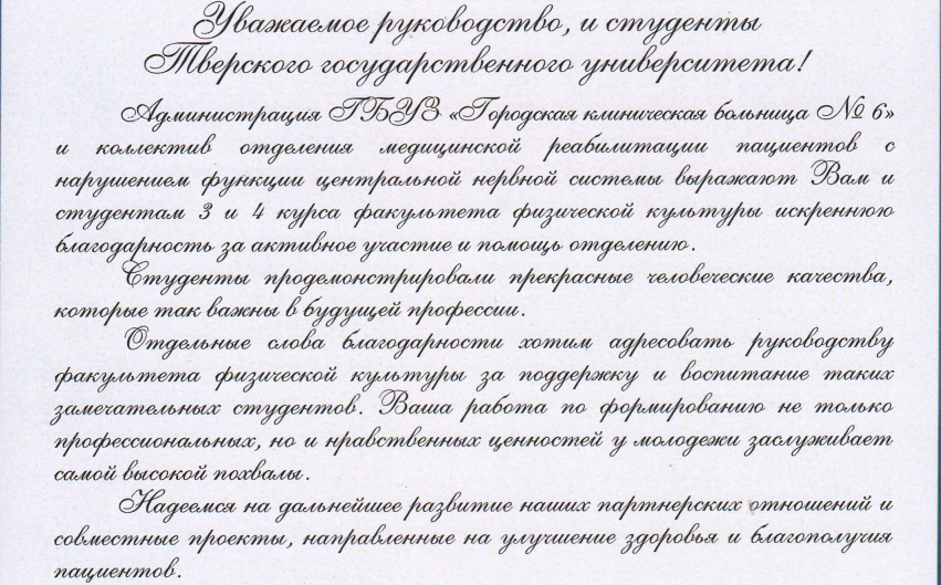 Руководство Городской клинической больницы №6 города Твери направило благодарственное письмо руководству и студентам 3 и 4 курсов факультета физической культуры. В рамках обучения по дисциплине "Физическая реабилитация" был по достоинству отмечен вклад наших студентов в процесс реабилитации пациентов. Мы гордимся нашими студентами и рады, что они смогли применить свои знания и навыки на практике!