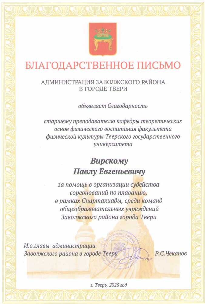 19 ноября 2025 студенты факультета под руководством Вирского П.Е. помогали в организации соревнований по плаванию в рамках Спартакиады среди школ города и показали себя на высоком уровне. В адрес факультета пришло благодарственное письмо от Администрации Заволжского района города Тверь. Факультет гордится своими студентами и преподавателя!